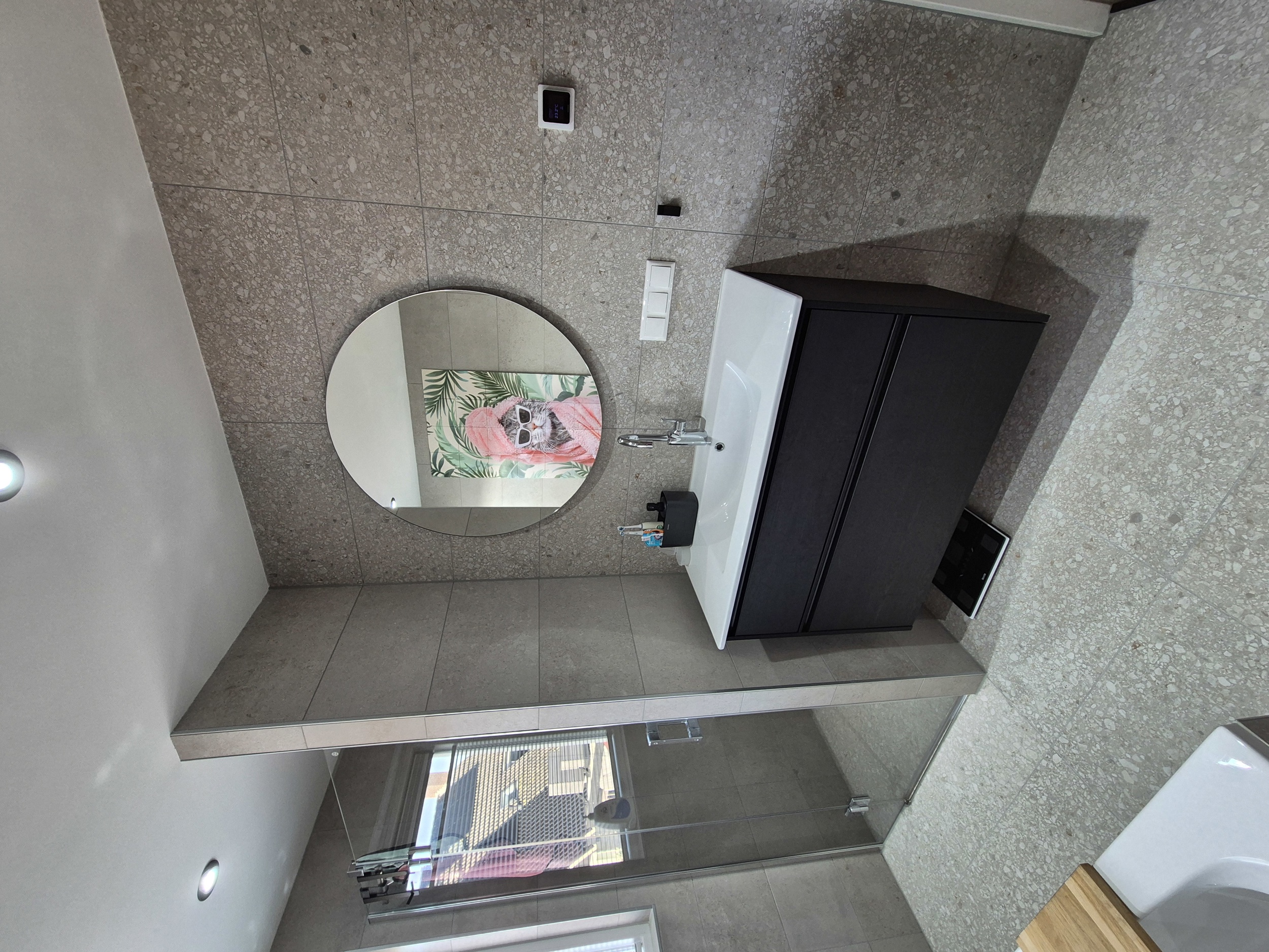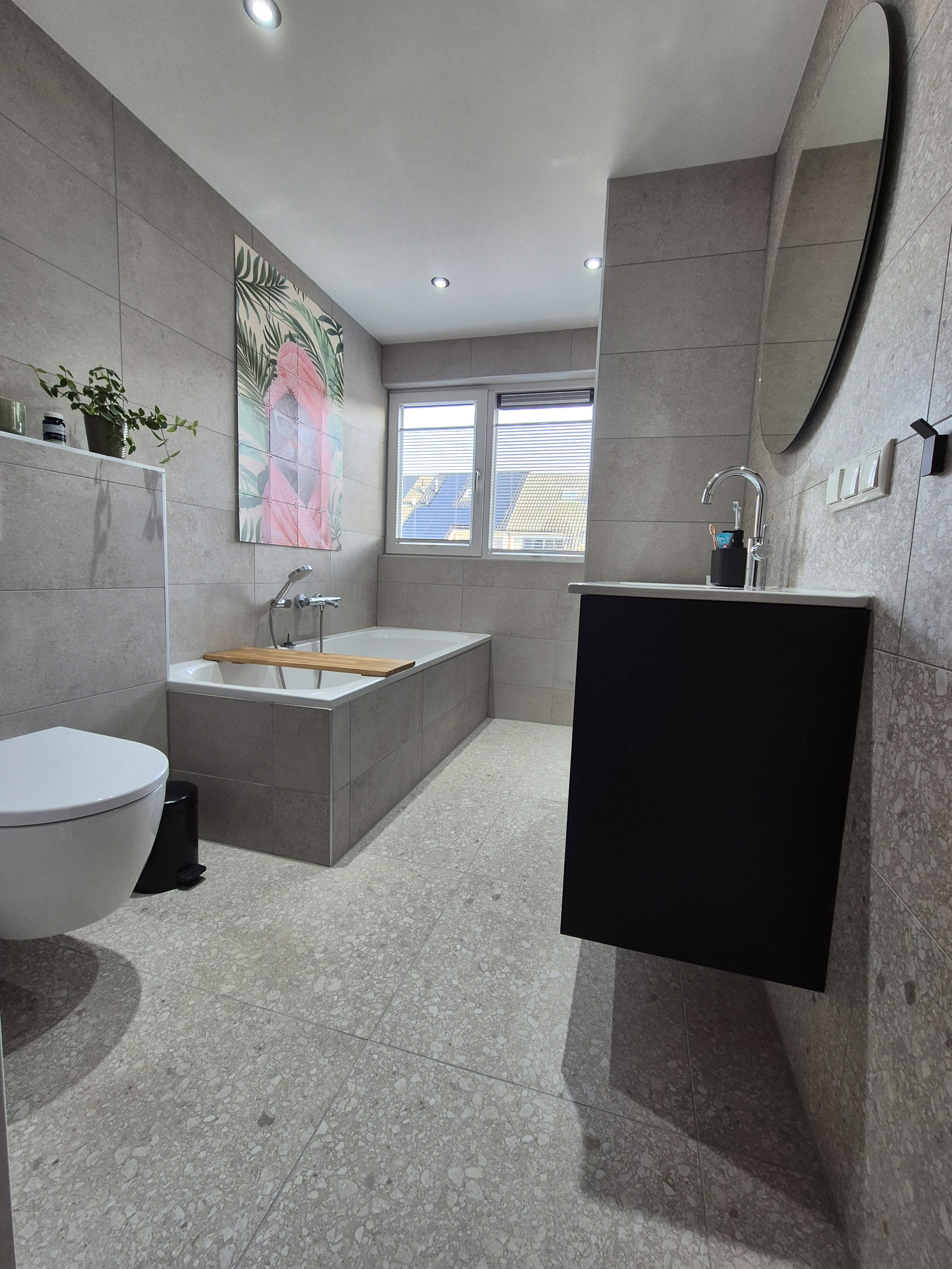 De badkamer is afgewerkt met zorgvuldig gekozen vloer- en wandtegels die zorgen voor een rustige en moderne uitstraling. Het toilet heeft dezelfde tegels gekregen waardoor beide ruimtes mooi op elkaar aansluiten en één geheel vormen.