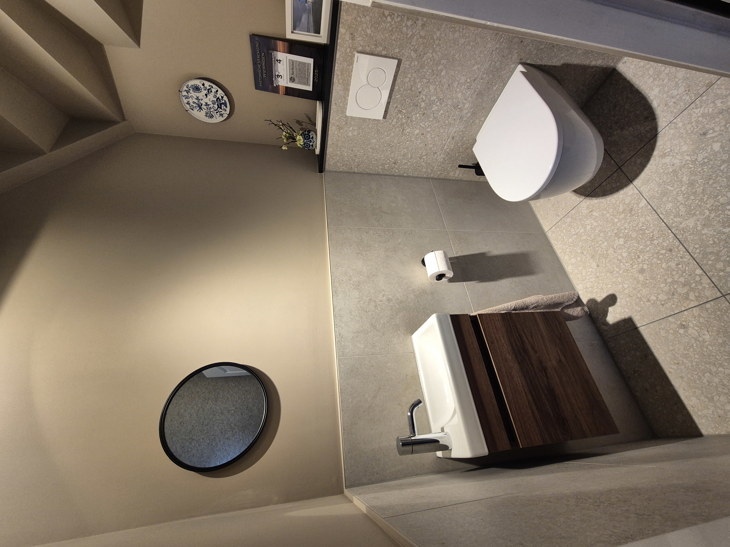 Badkamer en toilet met dezelfde tegels voor een rustige uitstraling